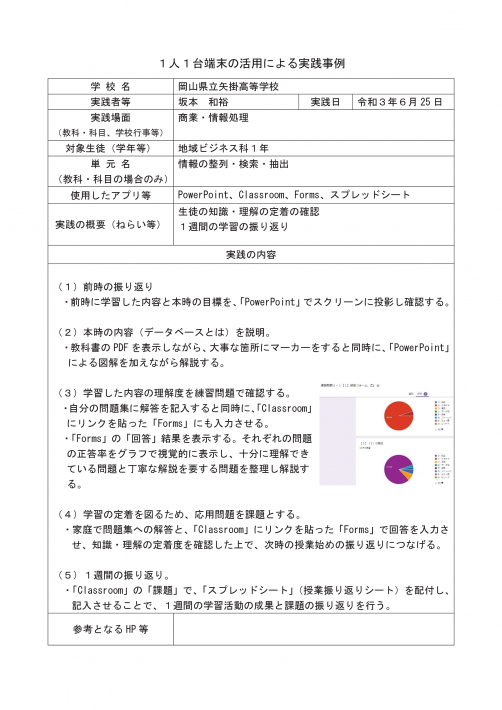 ホーム > ICT活用実践(高等学校) > 【実践事例報告】岡山県立矢掛高等学校の取組 1人1台端末の活用による実践事例(情報処理) 岡山県立矢掛高等学校の取組(情報処理)ダウンロード - 高等学校 商業 クラウドやアプリの活用, 効率化や省力化 振り返り