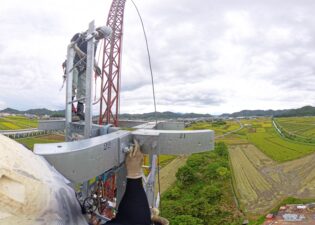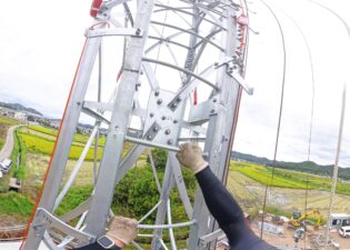 鉄塔建設は高い場所での作業となるため、作業する際は「ハーネス」という転落防止用の装備をつけて、安全対策をしっかり行います。細かく分けた材料を、クレーンで鉄塔の上まで運び、一つひとつ手作業で固定して組み立てます。高い場所での作業では、ボルトや工具などを落とさないよう気を付けなければなりません。また、地上で作業する人と無線機だけでコミュニケーションをとりながら作業を進めるので、チームワークや思いやりもとても大切です。